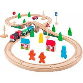 Obsahuje koleje, most, vlak se dvěma vagony, autíčko, značky, postavičky a stromy