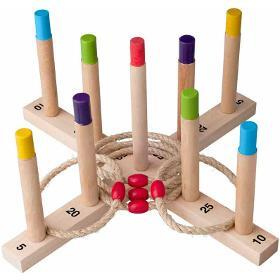Zábavný způsob, jak trénovat obratnostCílem je házet 5 pletených provazových kroužků na dřevěný kříž s tyčkami a získat co nejvíce bodů