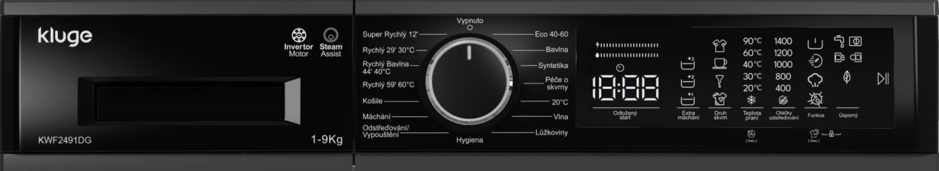 Kluge KWF2491DG se vyznačuje moderním designem s LED displejem, dotykovým ovládáním a ergonomickým otočným voličem. Displej s českými popisky usnadňuje nastavení a kontrolu pracích cyklů. Funkce Odložený start až o 23 hodin poskytuje flexibilitu, takže můžete naplánovat praní přesně podle svého harmonogramu.