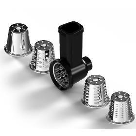 Kráječ a strouhač se 4 kužely z nerezové oceliNástavec na strouháníPěchovadloVelmi jemné struhadloHrubé struhadloStruhadlo na krájení plátkůJemné struhadlo