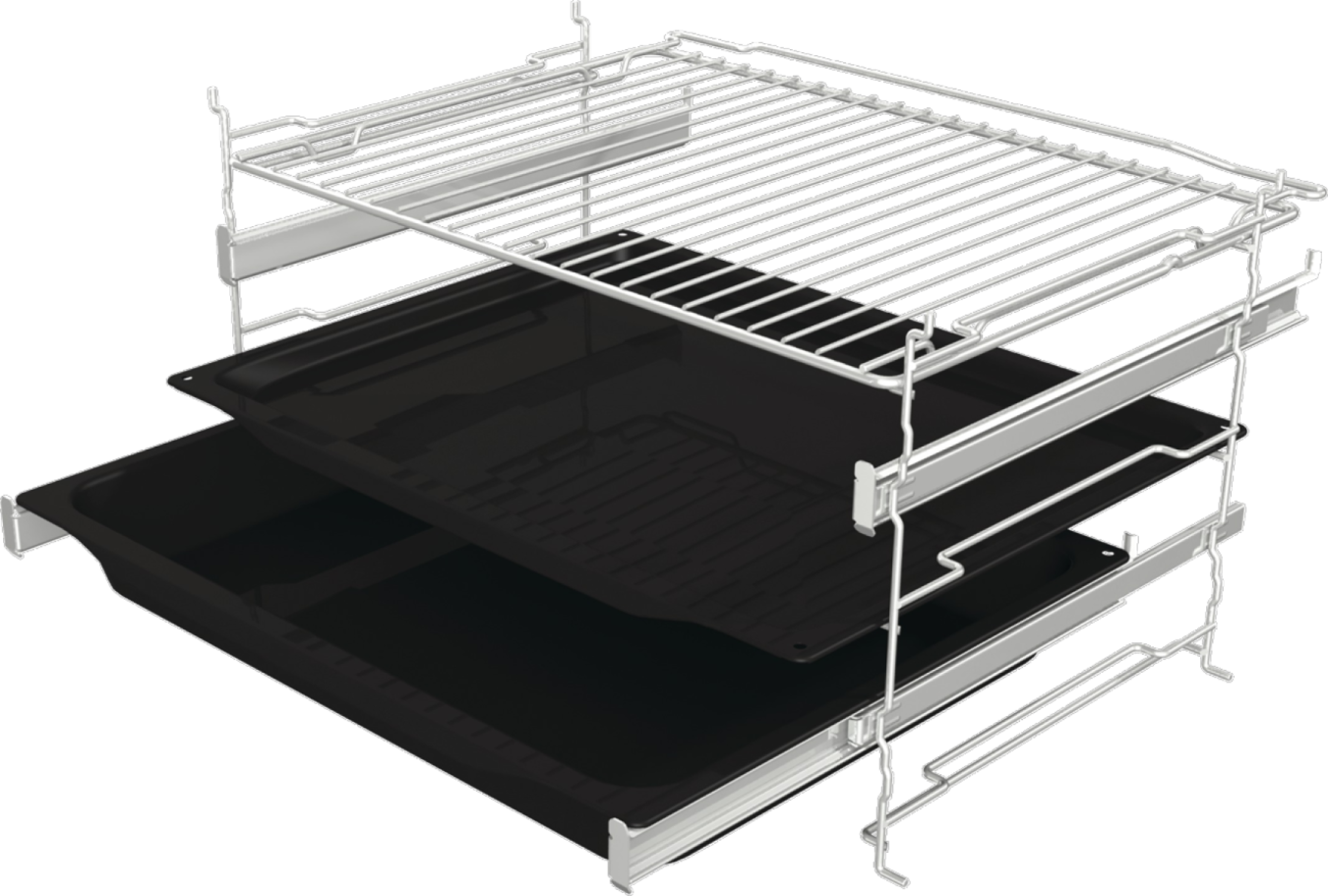 Teleskopická vodítka: Teleskopická vodítka s plynulým posunem poskytují dokonalý přehled o procesu pečení a bezpečnější a snadnější manipulaci s plechy na pečení. V závislosti od modelu jsou trouby Gorenje OptiBake vybaveny ¾ výsuvnými teleskopickými vodítky na jedné nebo dvou úrovních. Jako další možnost nabízíme také flexibilní jednoúrovňové teleskopické vodítka, které lze jednoduše zacvaknou na požadovanou úroveň.
